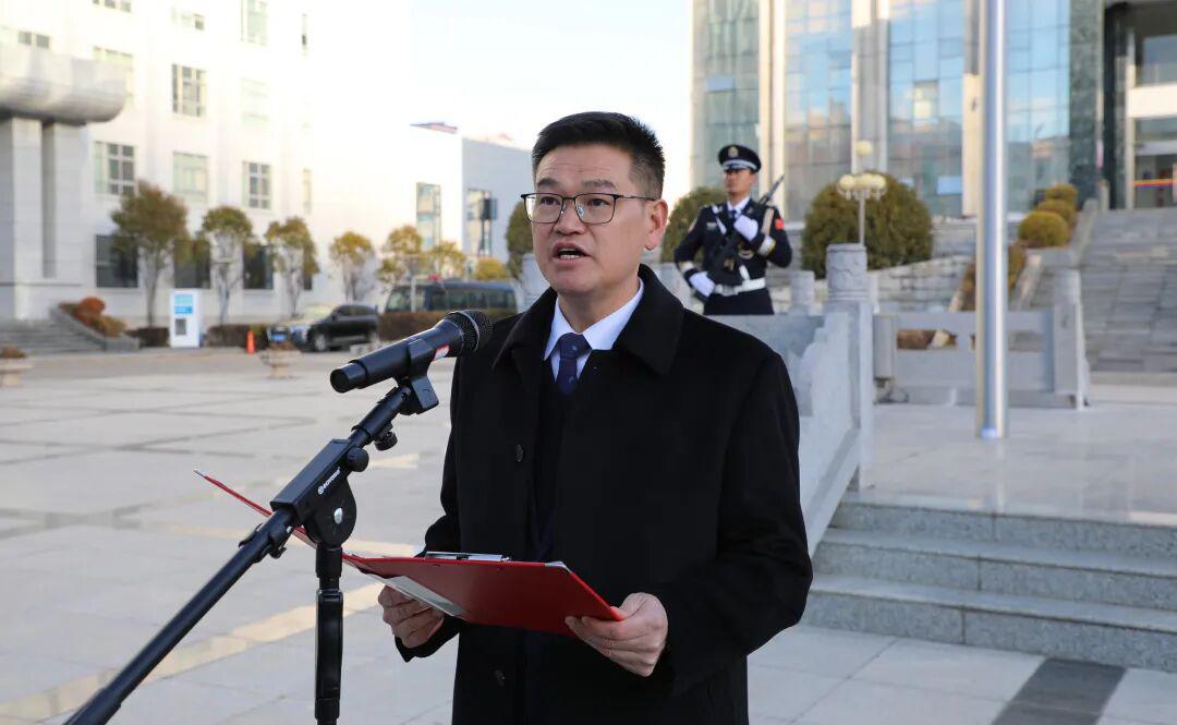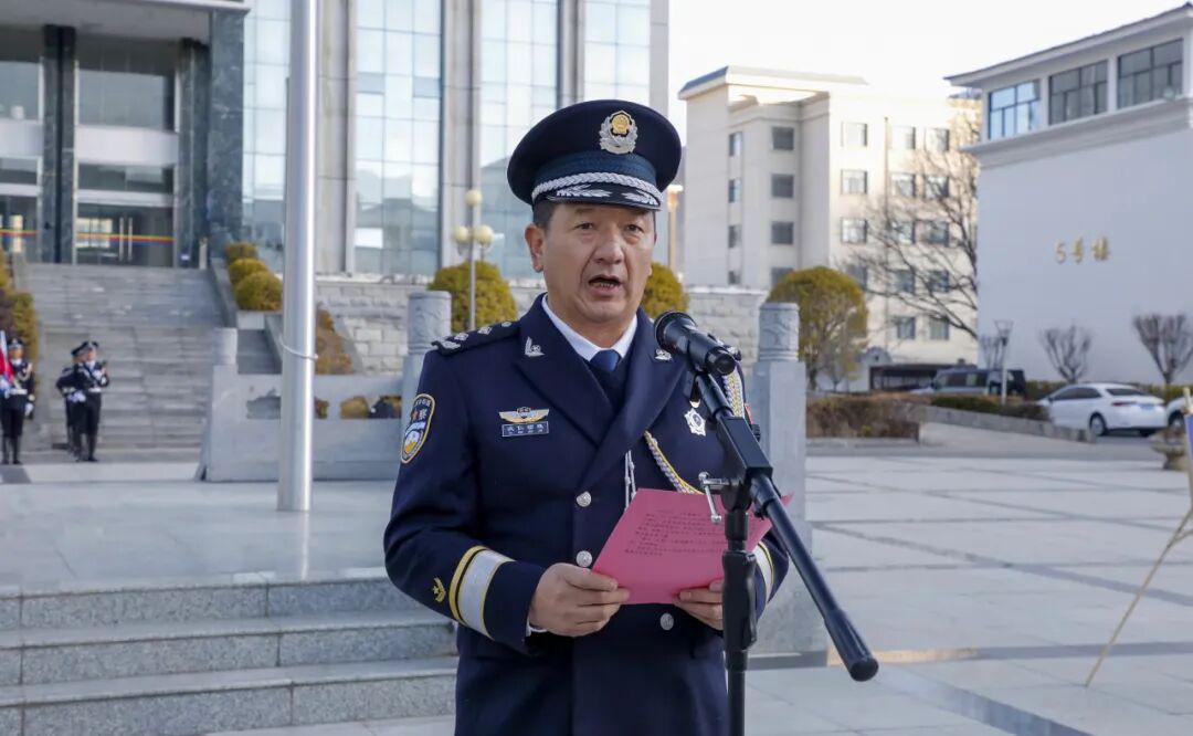 升旗仪式后,崔能飞代表市公安局党委,向全市公安民辅警、警属和离退休老同志,致以节日的问候和美好的祝福。