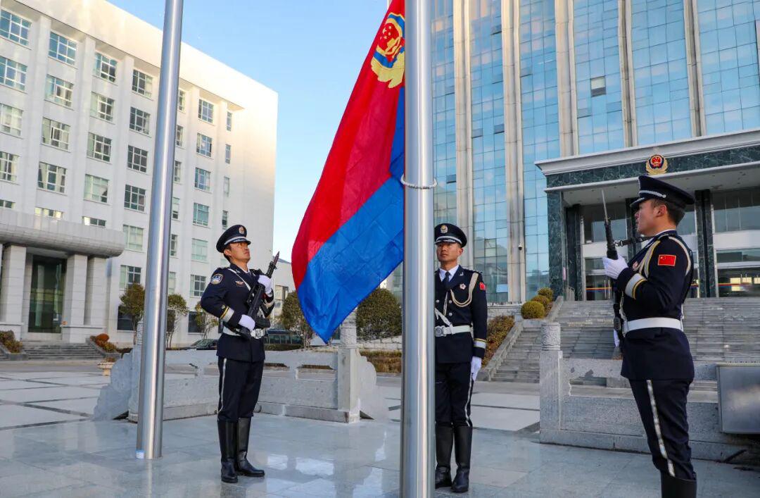 全体民警身着警礼服、列队整齐。“迎警旗——”指令下达,护旗手迈着铿锵步伐护送警旗走向升旗台。鲜红警旗映照着藏蓝身影,现场全员目光坚毅,满怀崇敬与自豪。《中国人民警察警歌》激昂奏响,警旗冉冉升起、迎风飘扬。