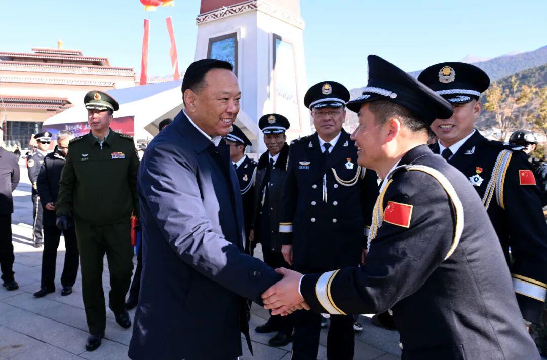 警力全开,法治同行。1月10日上午,林芝市公安局在工布公园响箭广场组织2026年中国人民警察节主题法治宣传和警用装备展示。市委副书记、市长巴塔,市委副书记罗布次仁等市领导莅临现场观摩指导,详细了解林芝公安现代化警用装备配备、“林芝猎犬”警务实战运用、法治宣传等工作情况,看望广大民辅警,并通过他们向全市公安民辅警致以诚挚问候和节日祝福,希望全市公安机关要始终把政治建设摆在首位,深学笃行习近平总书记重要训词精神,增强“四个意识”、坚定“四个自信”、做到“两个维护”,坚守服务人民根本宗旨,深化“放管服”改革、践行新时代“枫桥经验”,严打突出违法犯罪、抓实风险隐患排查,让群众的获得感、幸福感、安全感更加充实、更有保障;要恪守执法公正价值取向,坚持纪律严明治警要求,锻造一支让党放心、让人民满意的过硬公安铁军,以新担当新作为为建设更高水平平安林芝、法治林芝贡献公安力量。市领导崔能飞、王东升、次仁顿珠、杜元文一同观摩指导。
